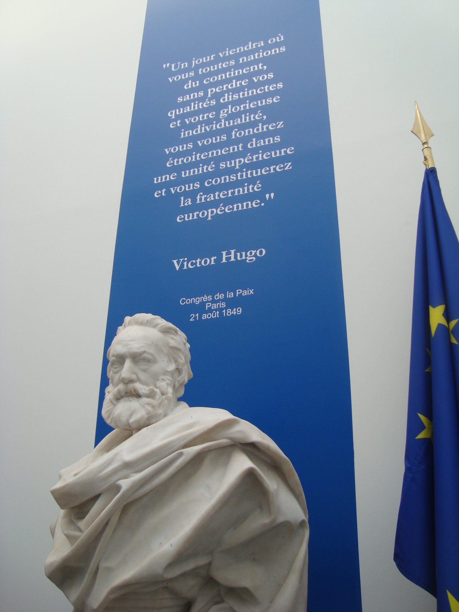 Un jour viendra où vous France, vous Russie, vous Italie, vous Angleterre, vous Allemagne, vous toutes nations du continent, sans perdre vos qualités distinctes et votre glorieuse individualité, vous vous fondrez étroitement dans une unité supérieure, et vous constituerez la fraternité européenne, absolument comme la Normandie, la Bretagne, la Bourgogne, la Lorraine, l’Alsace, toutes nos provinces, se sont fondues dans la France.” Victor Hugo