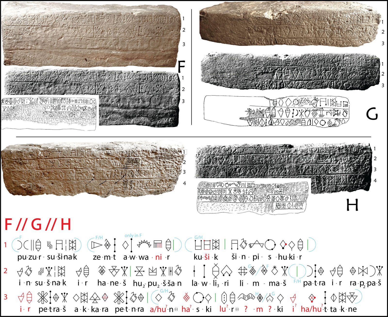 (1)Puzur-Sušinak zemt Awan-ir (kuši-k Šin-pishůk-ir) (2)Insuš(i)nak ir hane-š Hůp(o)šan lawlire lima-š pat-r-a i-r rapa-š (3)i-r petra-š aka-r-a pet(i)-n-r-a … i? hata-k-ne (or hůta-k-ne)